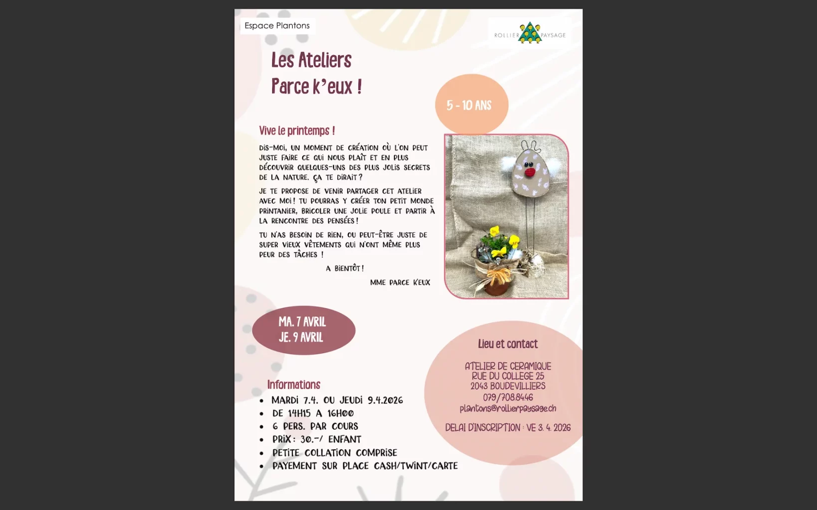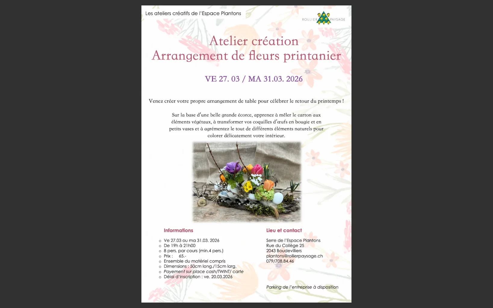 Pour toute information complémentaire, n’hésitez pas à nous contacter par mail (plantons@rollierpaysage.ch) ou par téléphone (079.708.84.46).