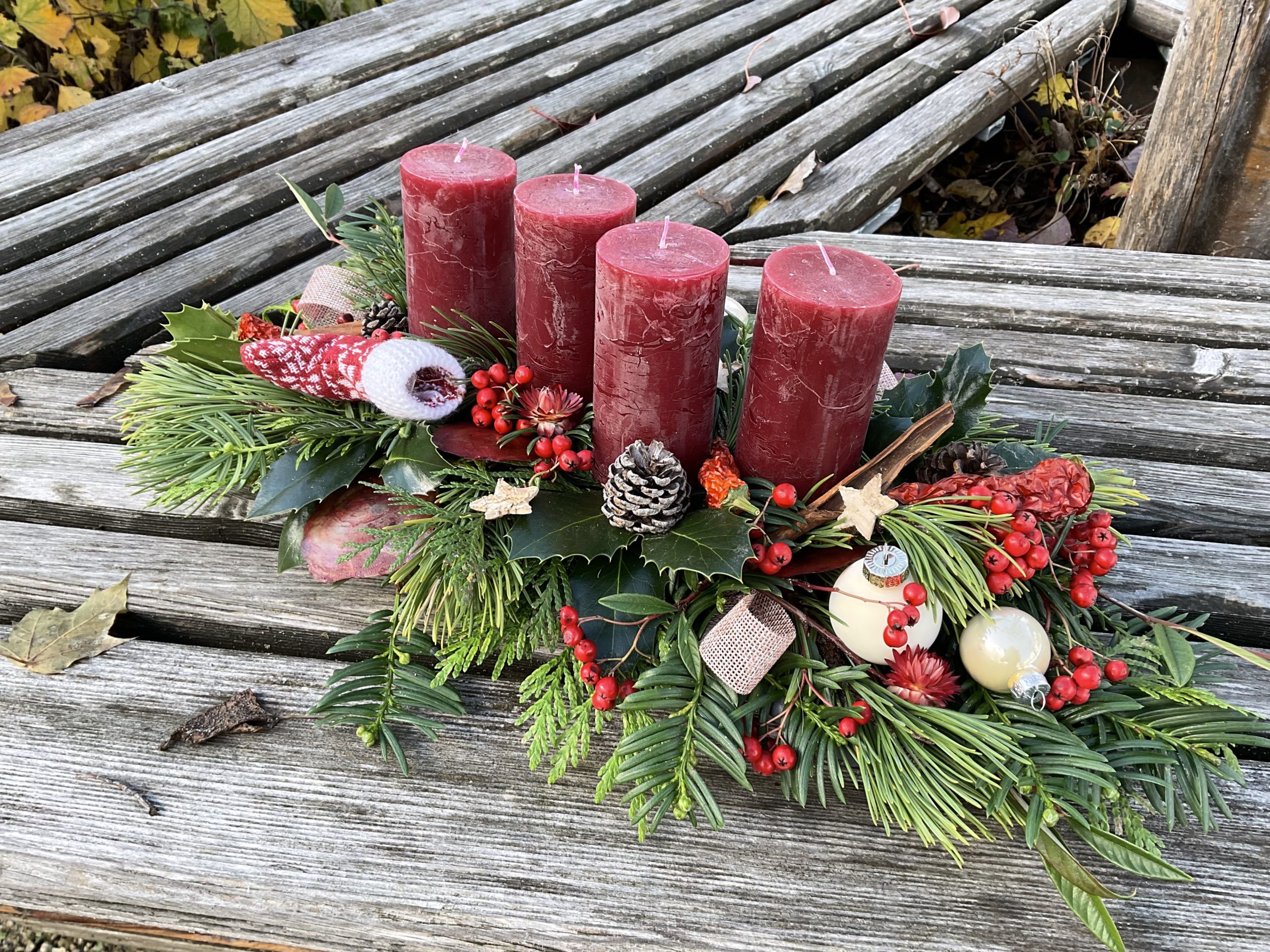 Arrangement avec 4 bougies. Possibilité de choisir des tons chauds/dorés ou froids/argentés.