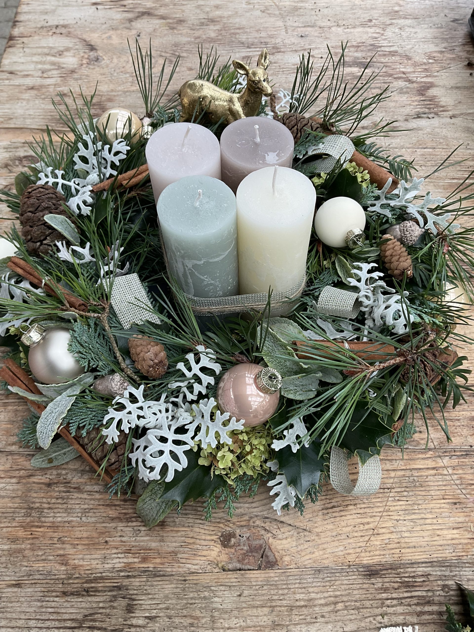 Couronne de l’Avent sur une base d’eau, ce qui lui permet de garder sa fraîcheur plus longtemps. Possibilité de choisir des tons chauds/dorés ou froids/argentés.