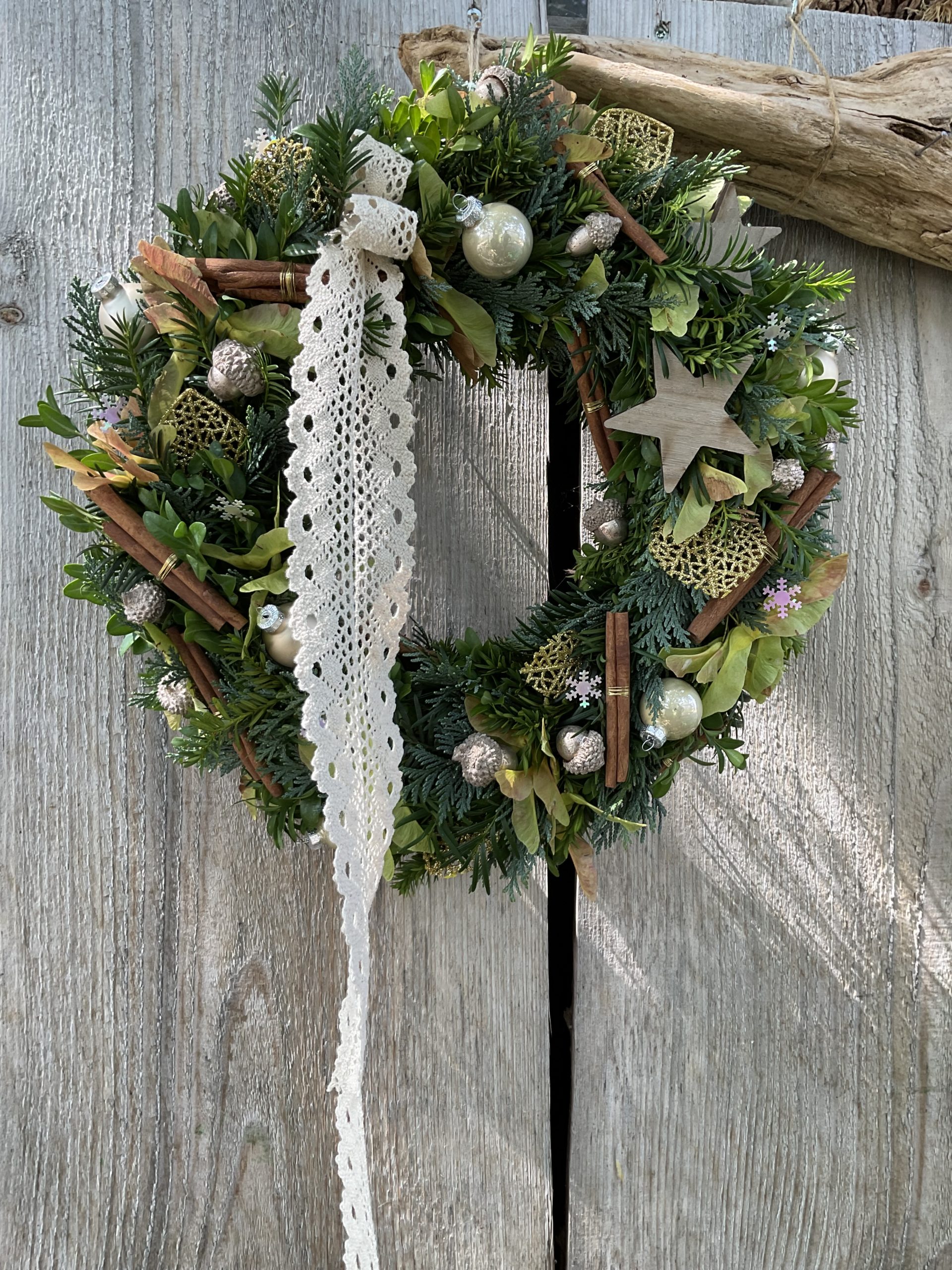 Couronne de porte sur un anneau en paille. Possibilité de choisir des tons chauds/dorés ou froids/argentés.