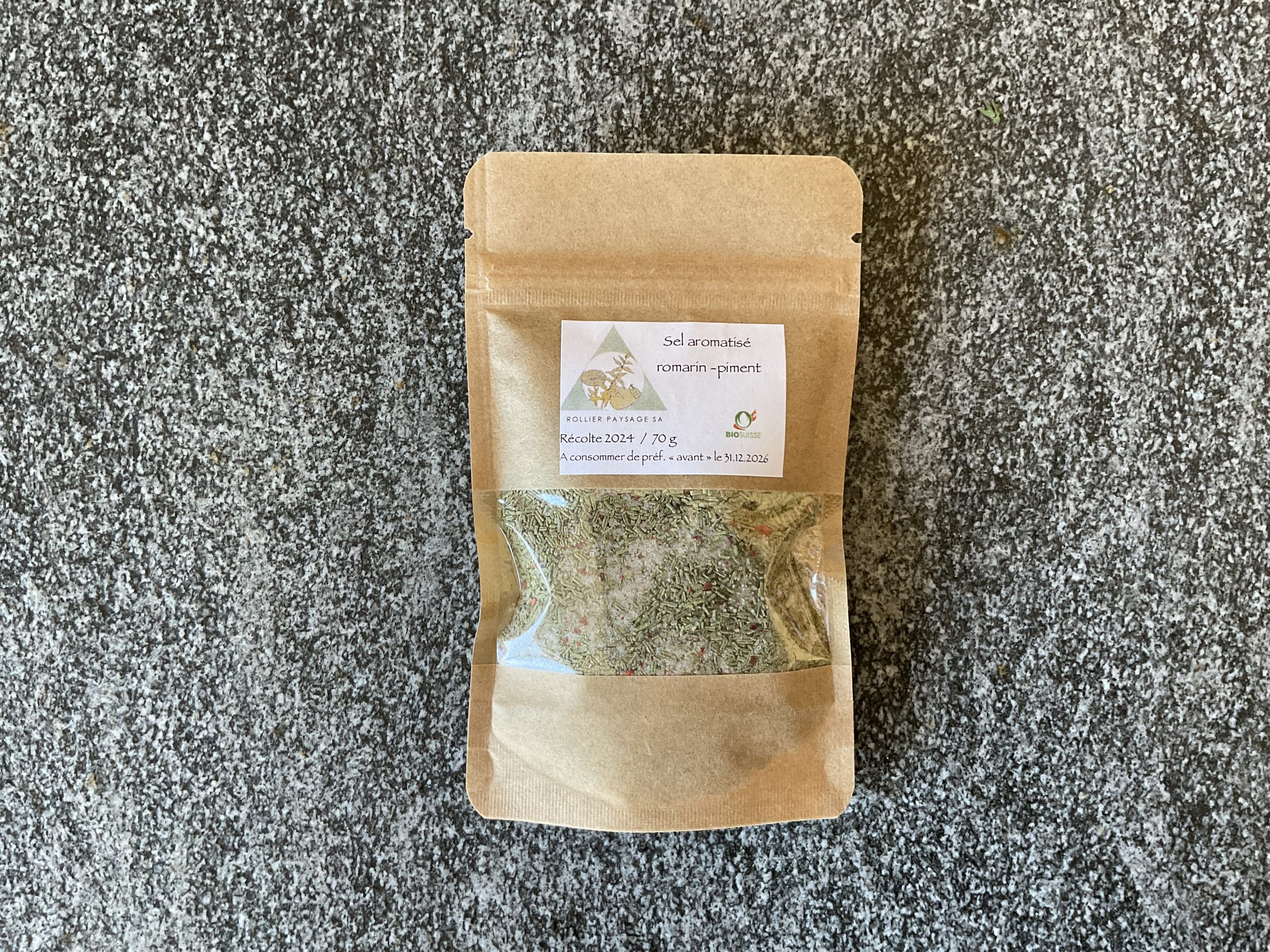Sel aromatisé au romarin et au piment d’Espelette, Bio Suisse.